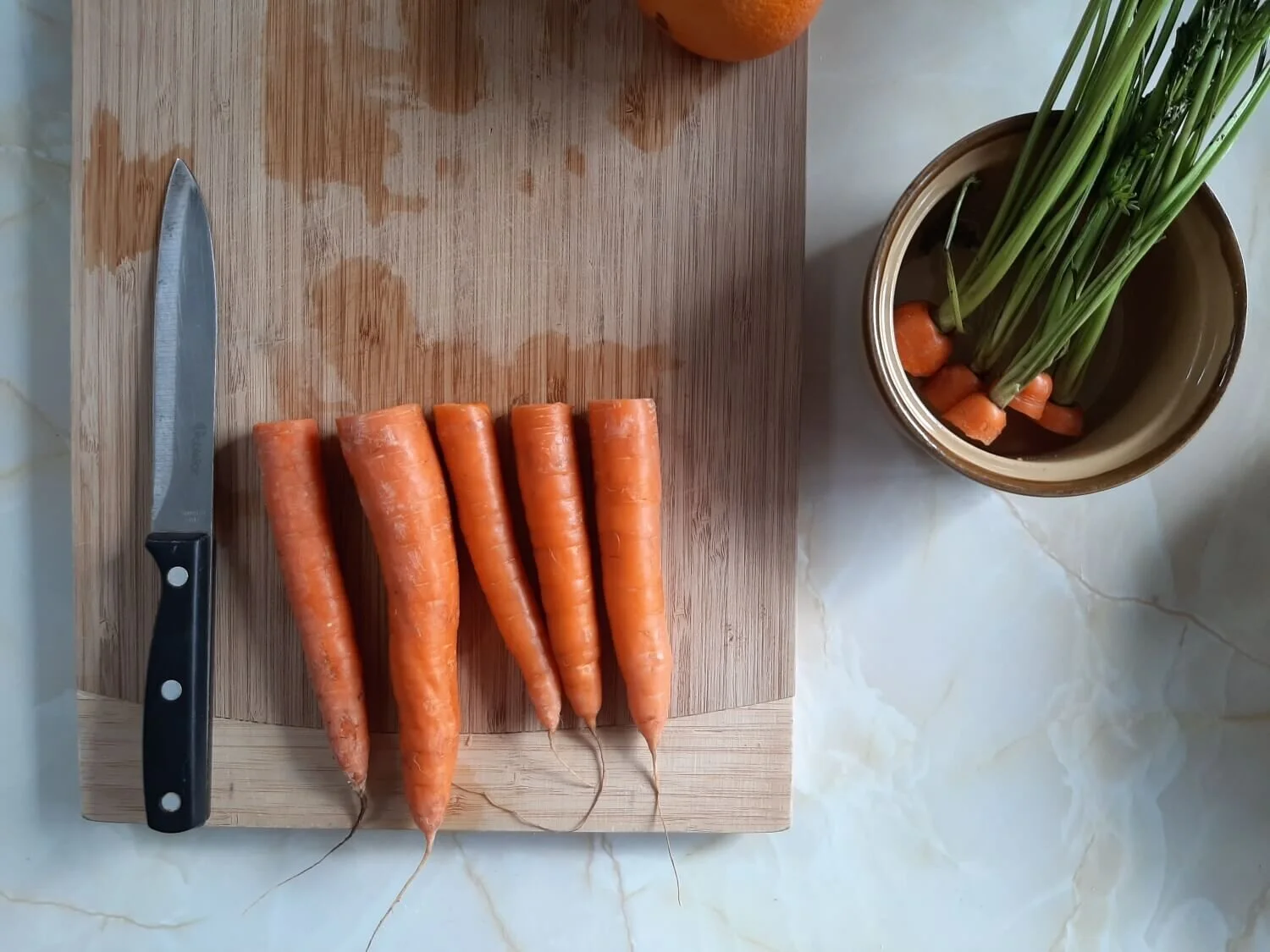 Wash the carrots and chop their tops off. Keep the carrot tops to one side for decoration.