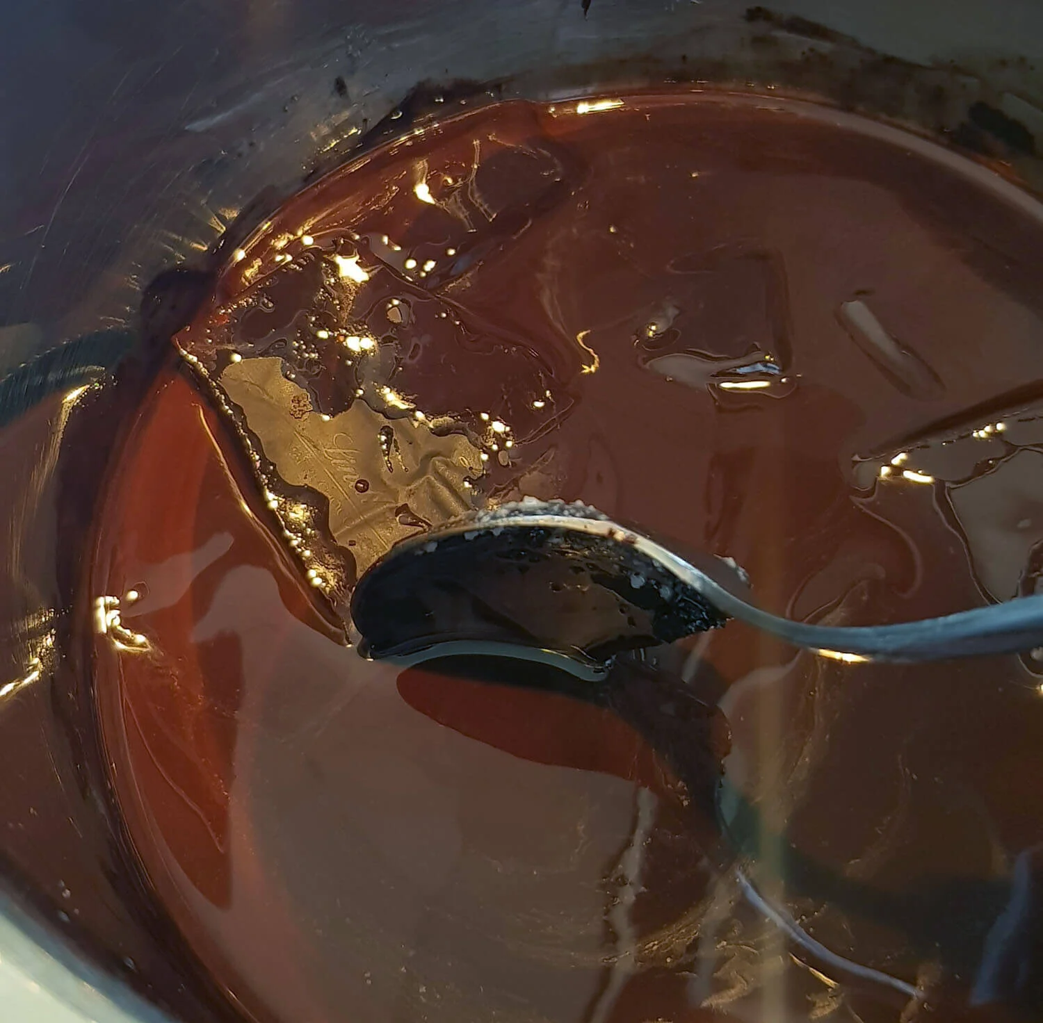 2. Add dark chocolate chips or pieces to the saucepan and stir until the chocolate has melted.