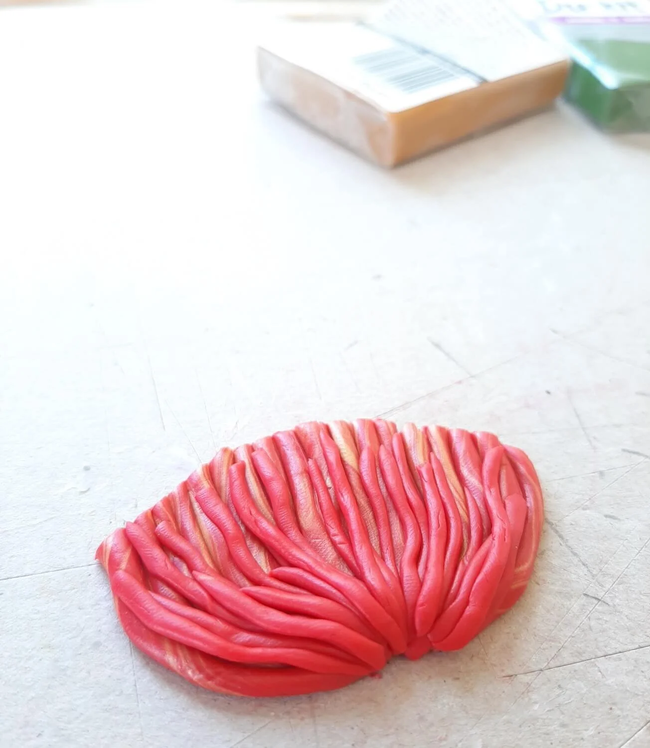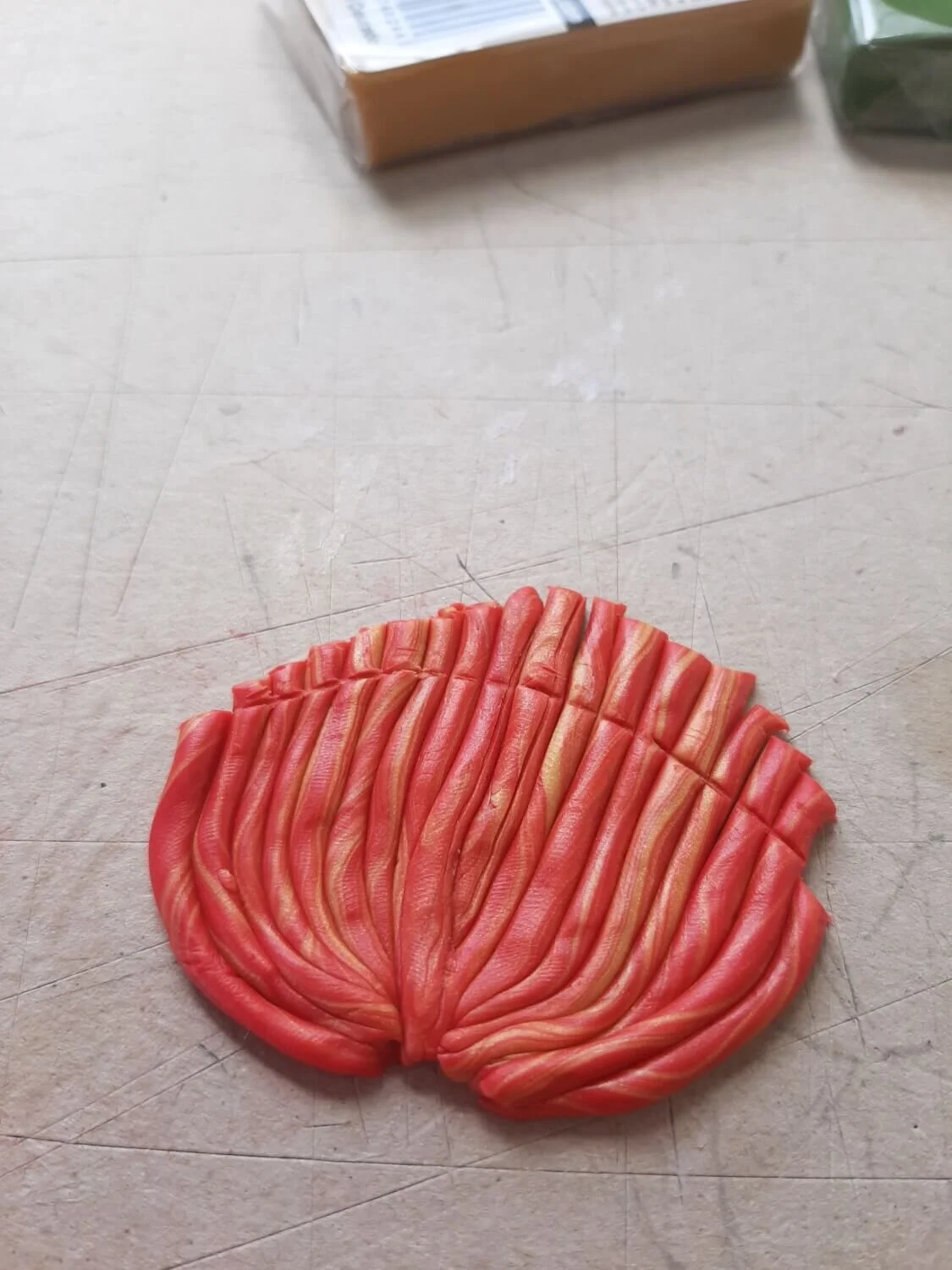2. Next, roll your marbled clay into very thin little sausages and pack them next to each other until a rough fan shape is formed.