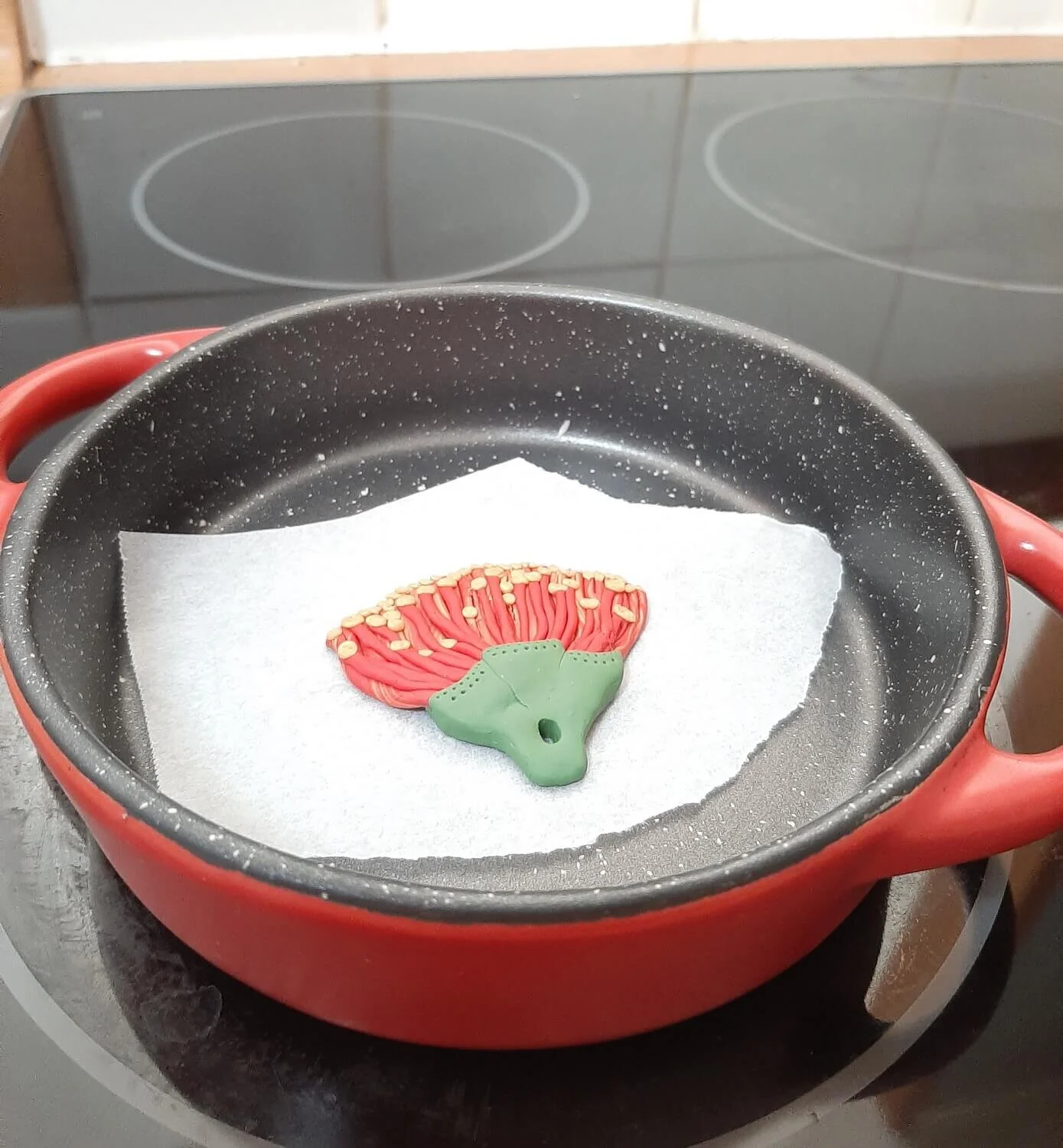 1. To get the perfect Pohutukawa flower colour, mix a small ball of the red and gold clay together to create a marbled effect.
