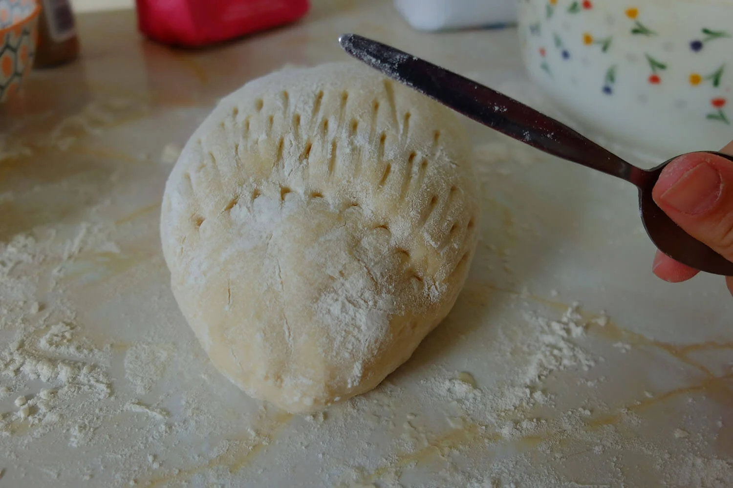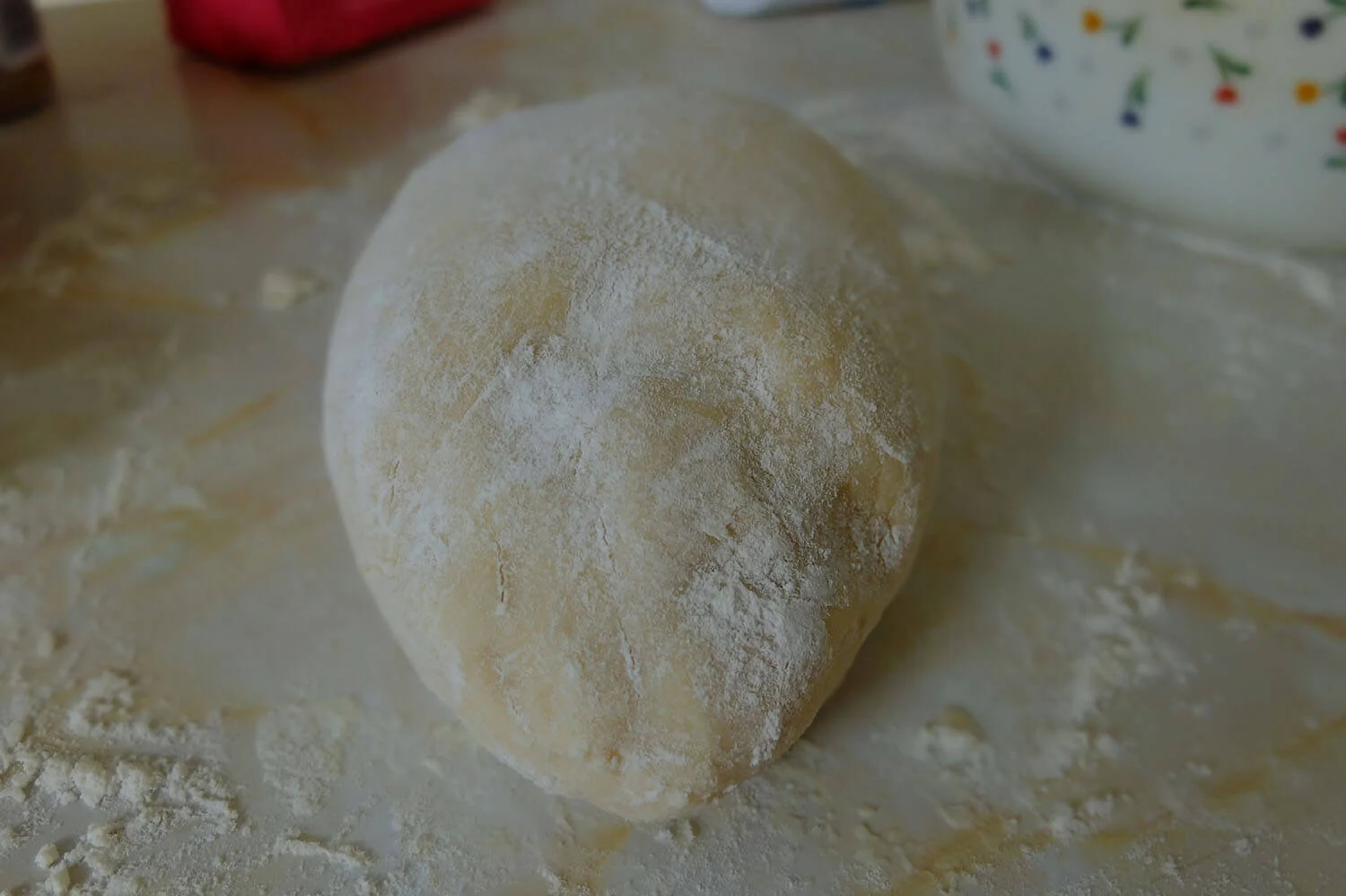 When your dough has come together (and is squishy), pick it up from the bowl and drop it onto a flat clean floured surface. If the dough is too sticky sieve more flour over it.