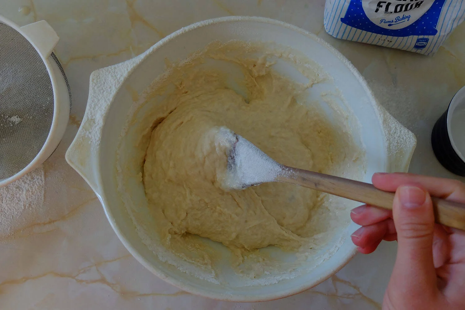 Use a whisk to ensure there are no lumps. Then, as it thickens, use a wooden spoon to continue to mix in the flour.Knead the dough