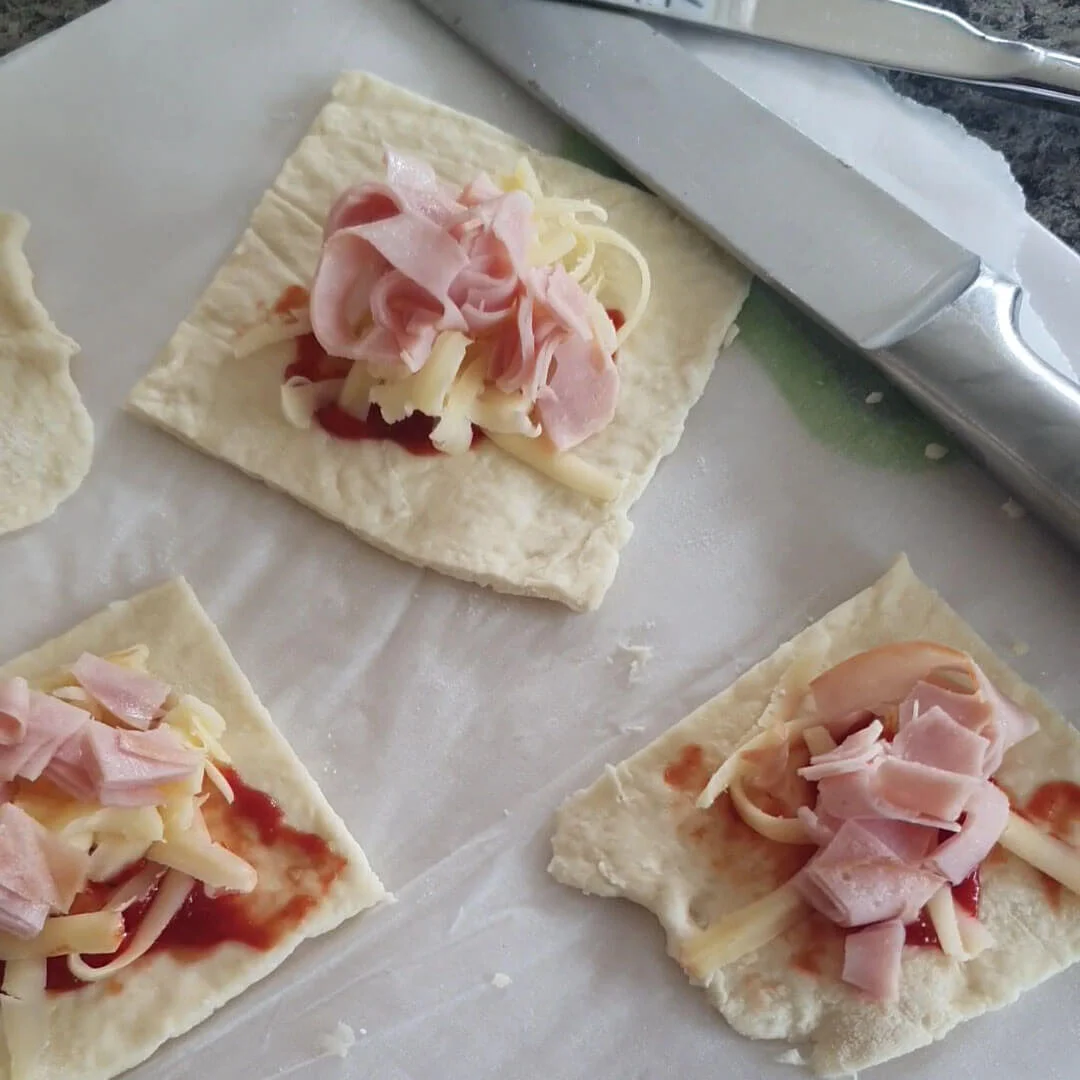 Stick to the centre. Make sure that there is a border of dough that does not have pizza sauce or fillings on it, all the way around each square.