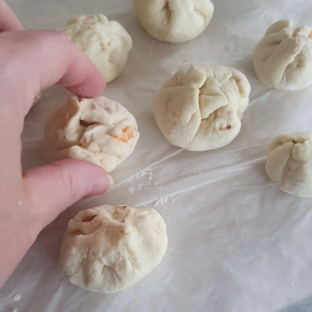 9. Line a baking tray with baking paper and space your pizza balls approx 2cm apart and with the side that was pinch closed facing downwards.