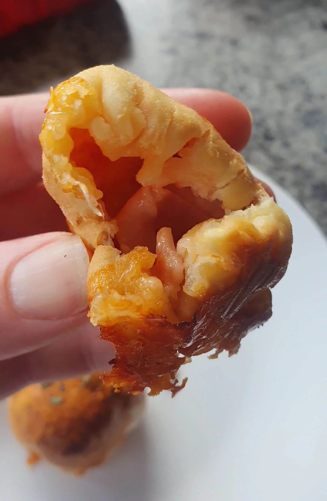 Tip: don’t add too much cheese, or too many fillings, or the pizza balls will burst open when you bake them. If you want lots of fillings, try making larger square shapes.