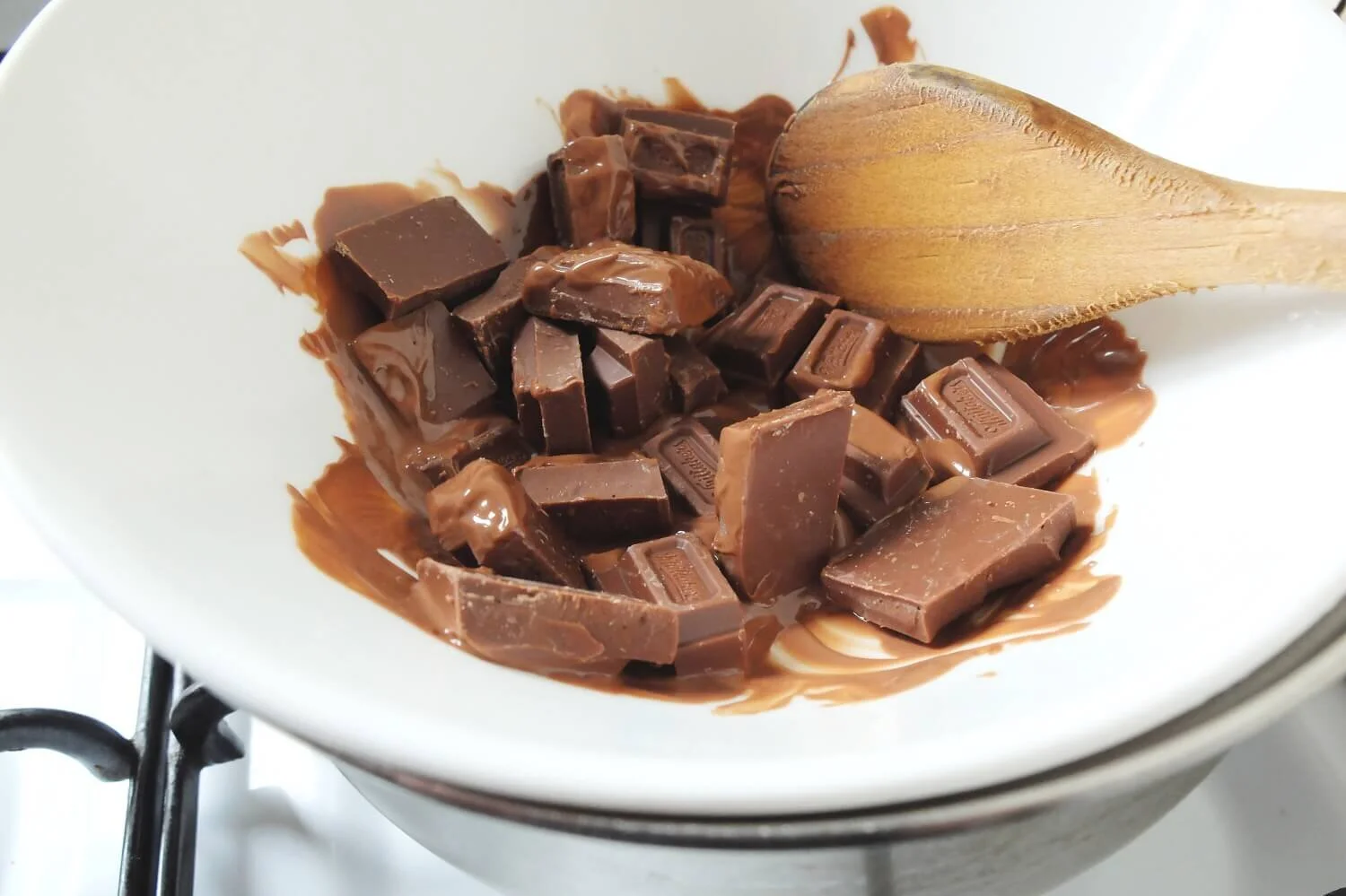 Bring an inch of water to a simmer in the cooking pot and sit the bowl over the hot water. Make sure the pot stays gently simmering and stir the chocolate with a wooden spoon until it is completely melted.Let the chocolate cool a little, but don’t let it set. Then pour it into your bowl of whipped cream and whisk them together until well blended, light and thick.