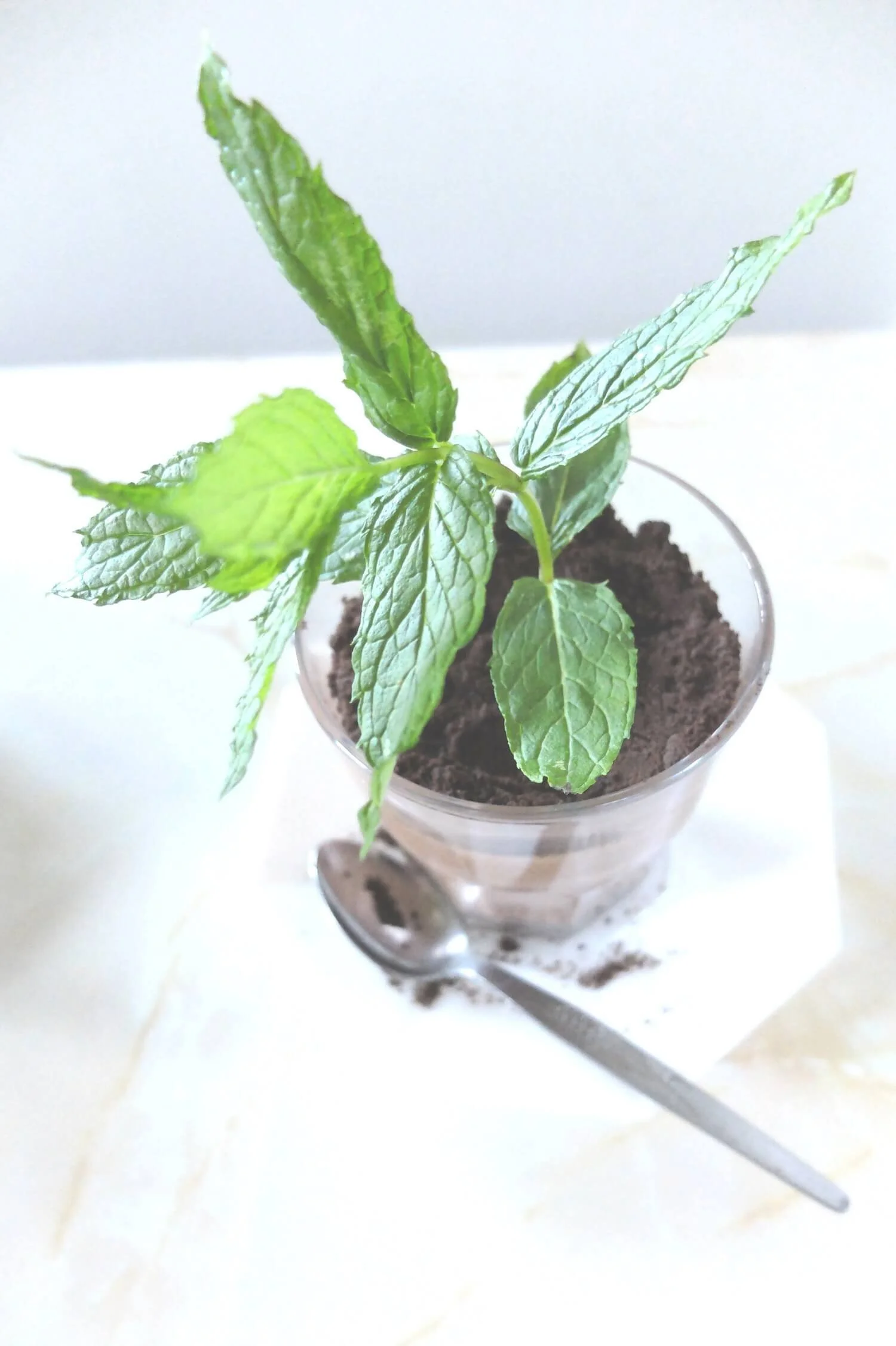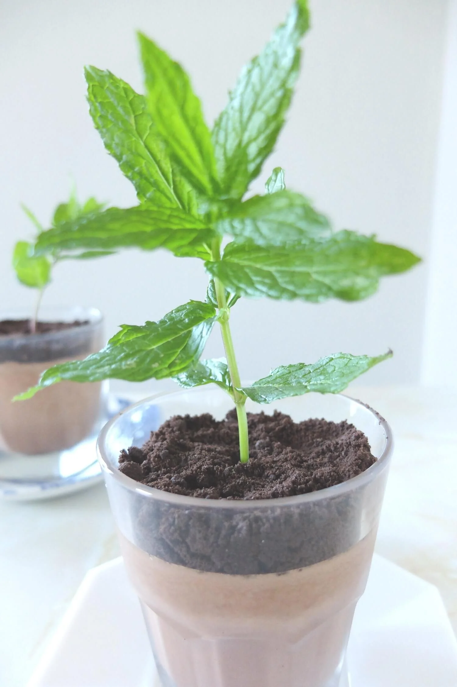 This homemade chocolate mud mousse topped with Oreo crumb soil is completed with one sprig of mint shooting up from the centre. It’s delicious and easy to make.