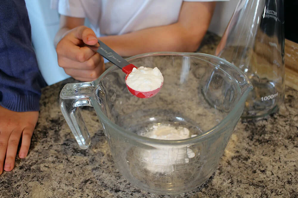 Add four tablespoons of baking soda to your glass container.