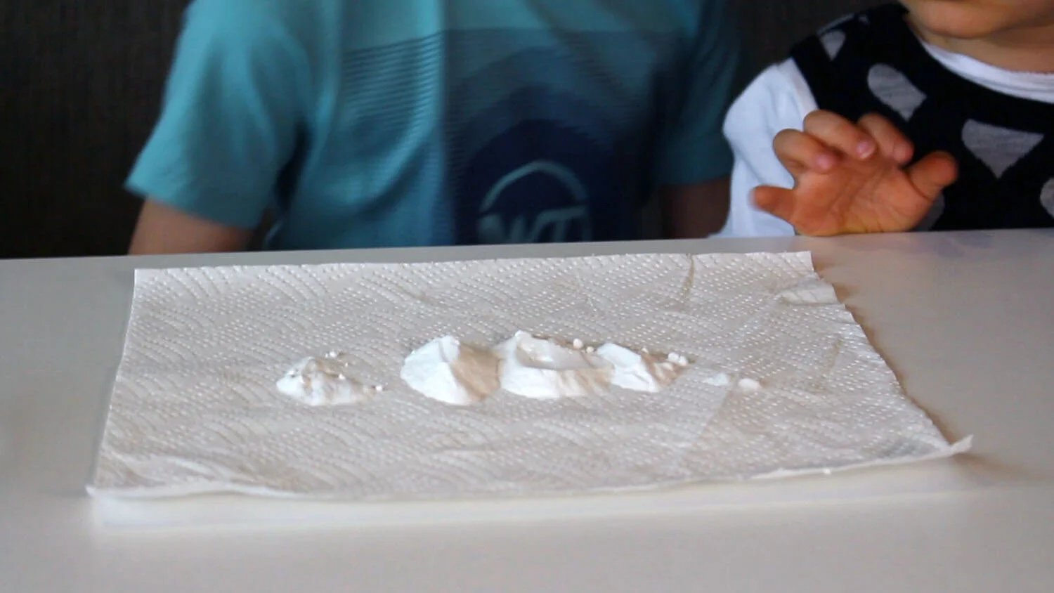 Wait patiently as the paper towel dissolves, releasing the baking soda into the vinegar.