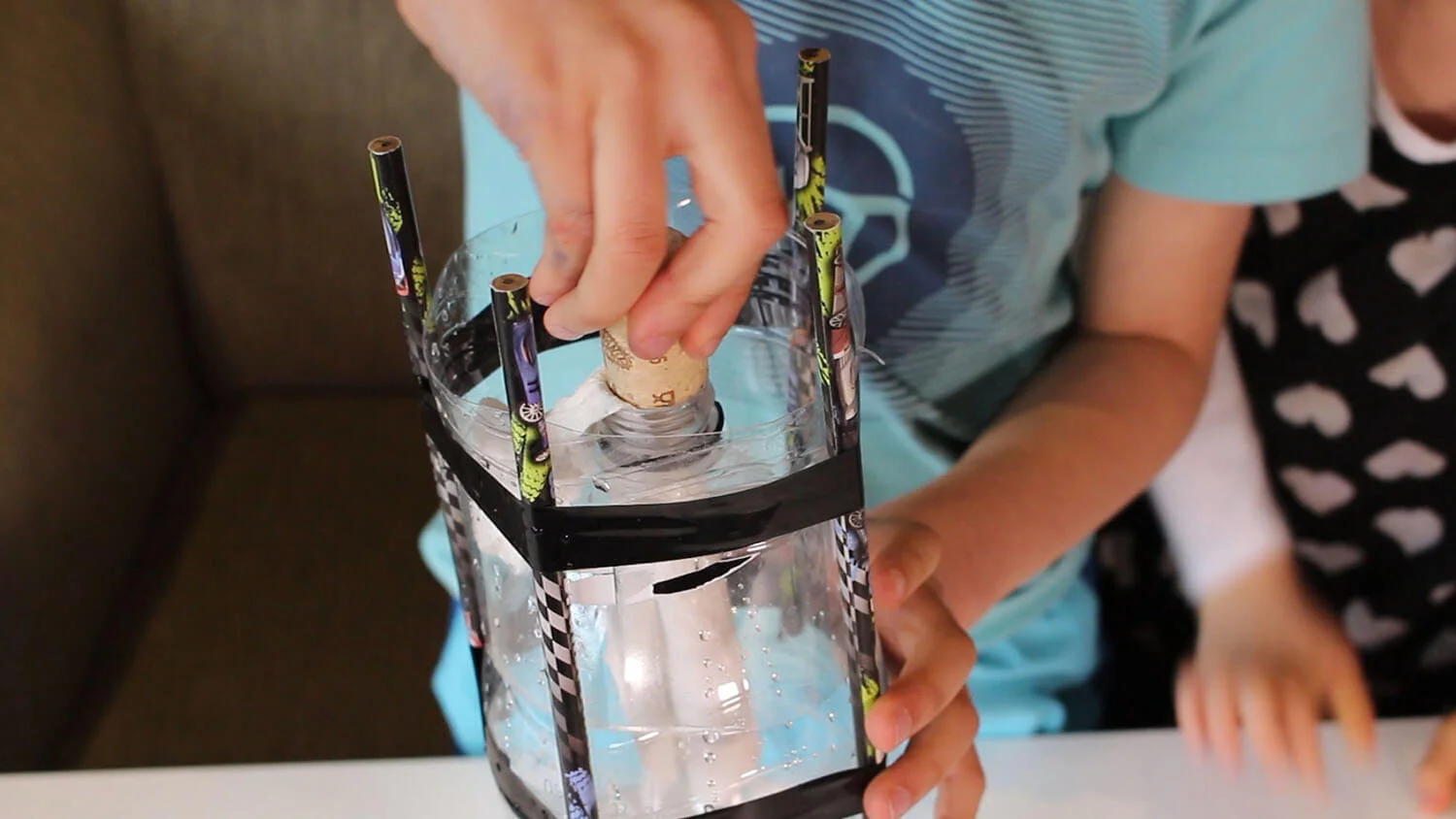 Turn your bottle upside down (so that the nozzle is facing down) and tape the 4 pencils to the outside of the bottle – this will be your rocket base. Make sure that the bottle nozzle sits about 2cm off the ground. PRO TIP: Use a funnel to fill your bottle with 1 litre of water, screw the cap on and flip your bottle over to check to see if your pencils will hold the bottle upright. If not, try readjusting your pencils until it can, then tip out the water.