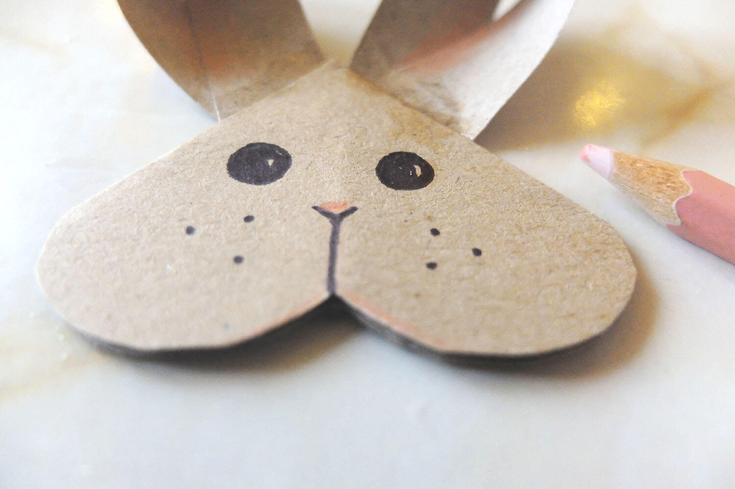 Draw on the rabbit’s mouth, nose and eyes. Use a light pink pencil to colour inside the ears and on the nose.