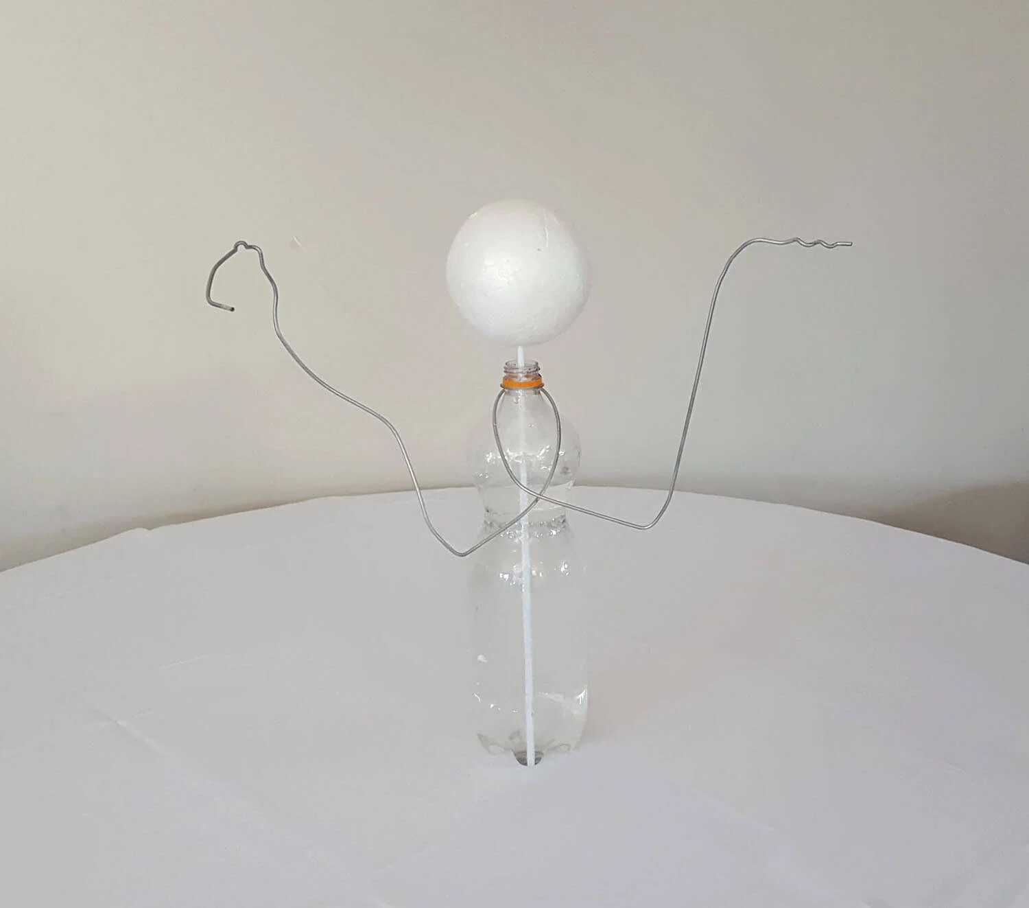 4. Ask a caregiver to help you wrap wire around the neck of the soft drink bottle and create two arm shapes.