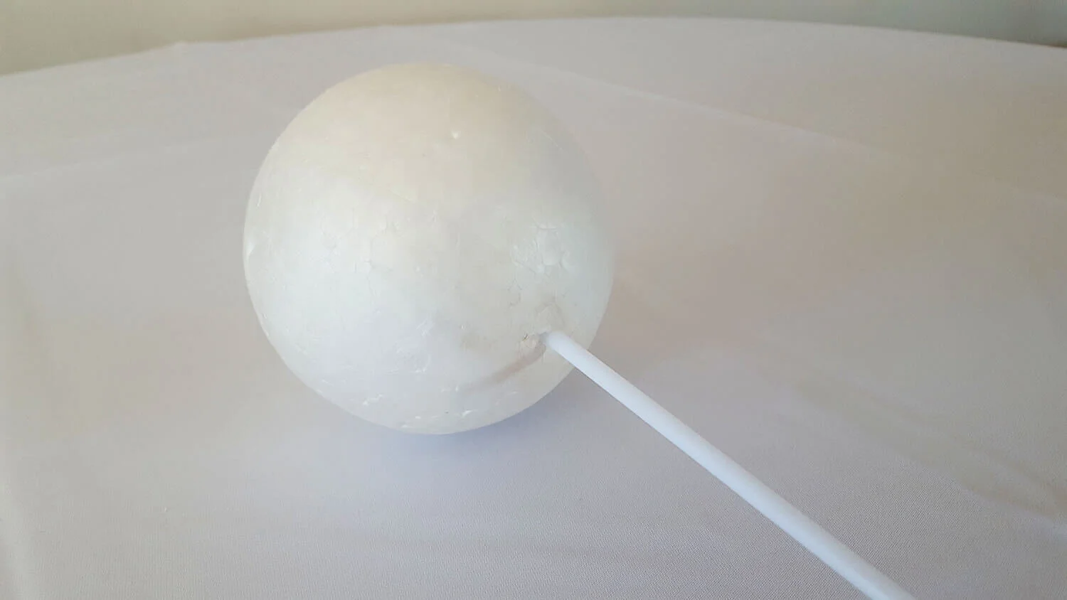 1. Insert your chopstick (or other stick) into the base of the polystyrene ball. This will be your ghost’s head and neck.