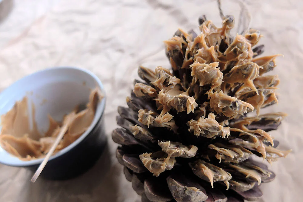 Cover one half of the pinecone with peanut butter and place it into your container of birdseed, with the peanut butter side face down.