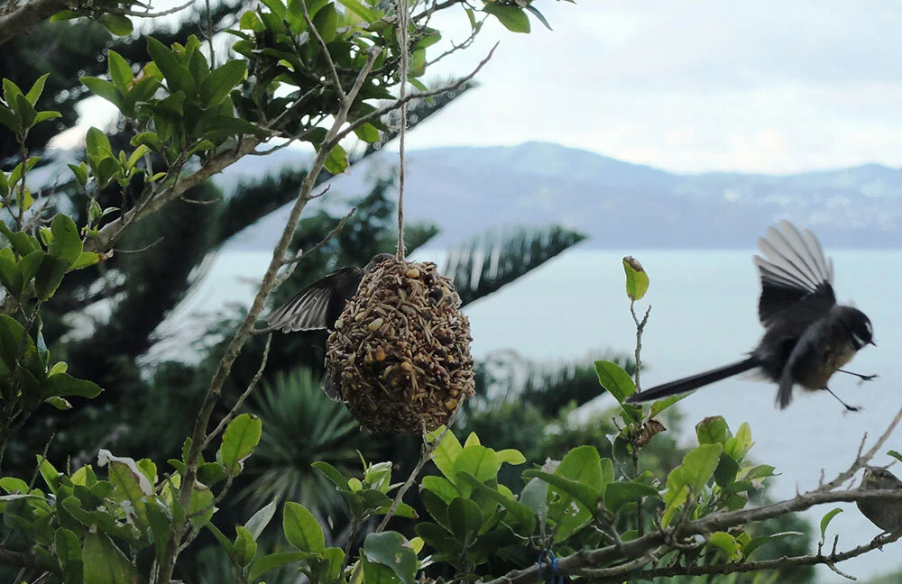 We spotted Silvereyes, a Greenfinch, Chaffinches and Sparrows eating at our feeder which also attracted a sociable Fantail.