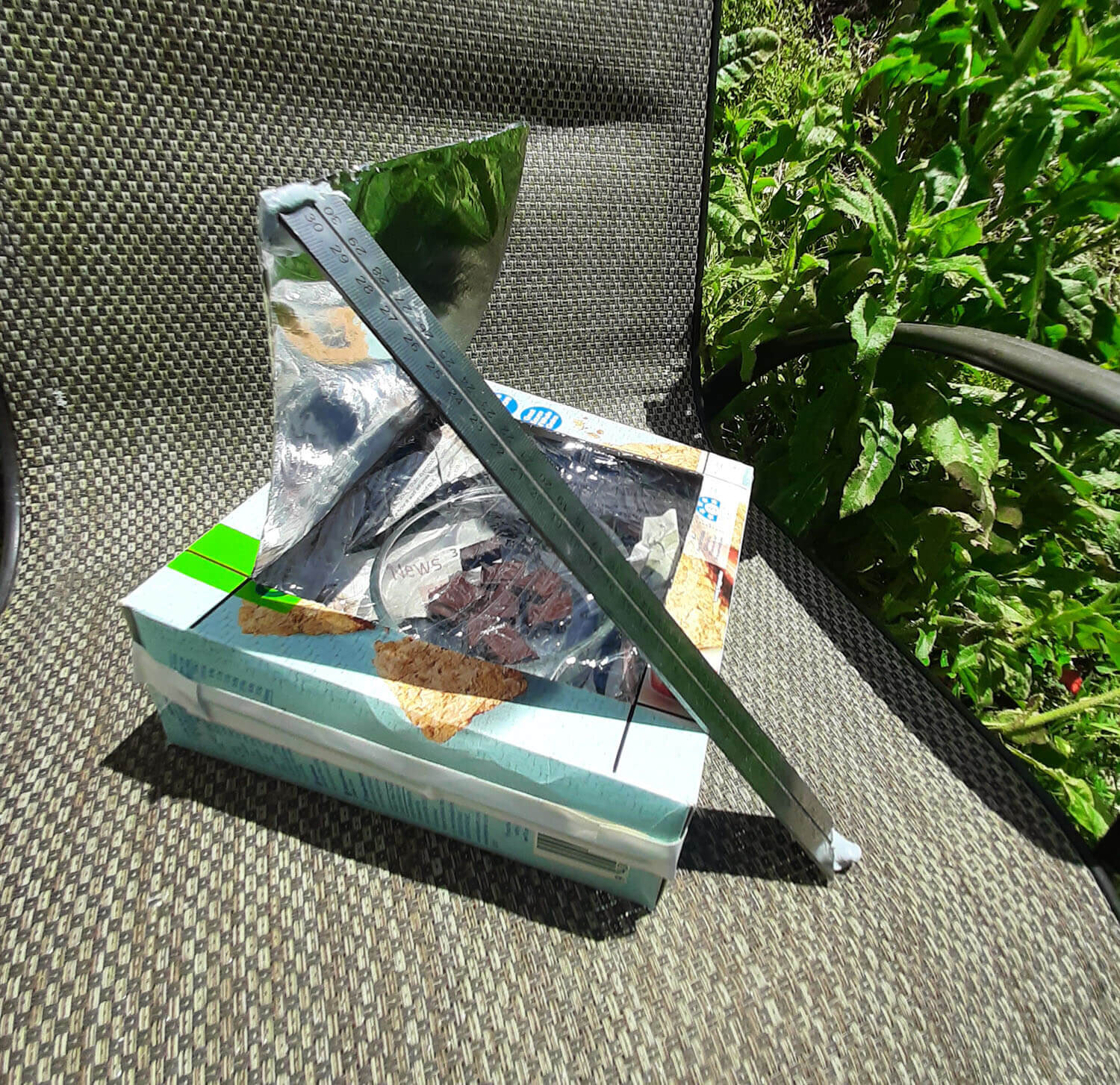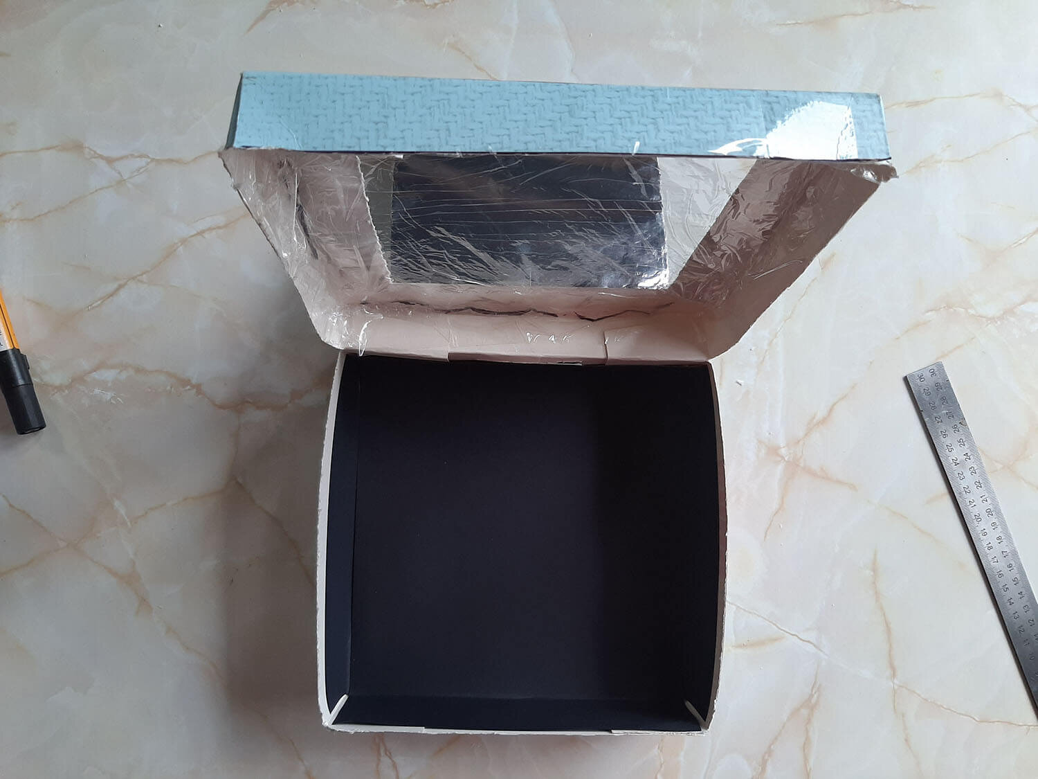 The tin foil reflects the rays of sunlight into the box through the plastic window.