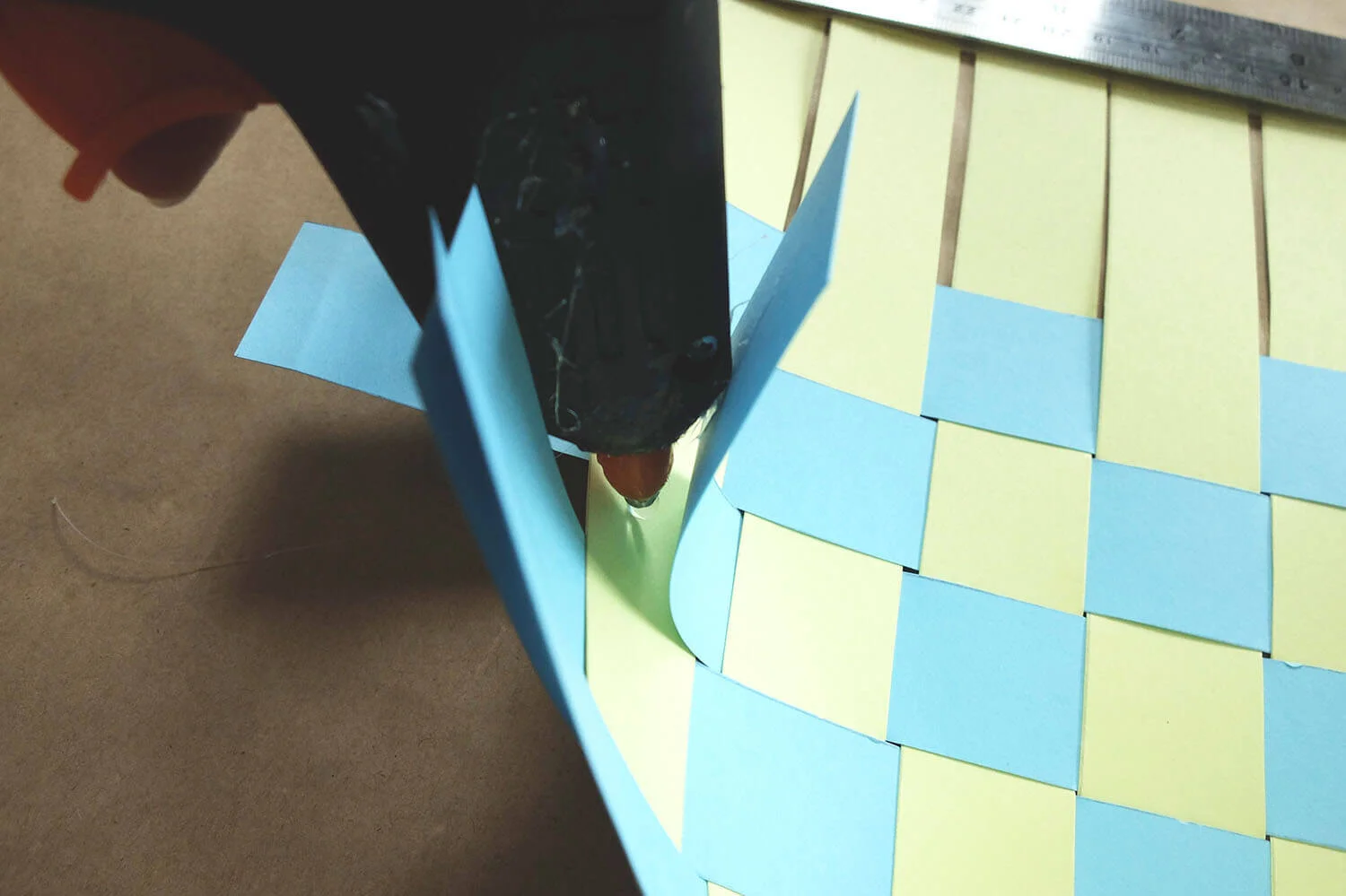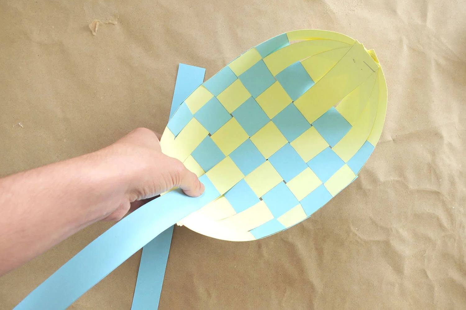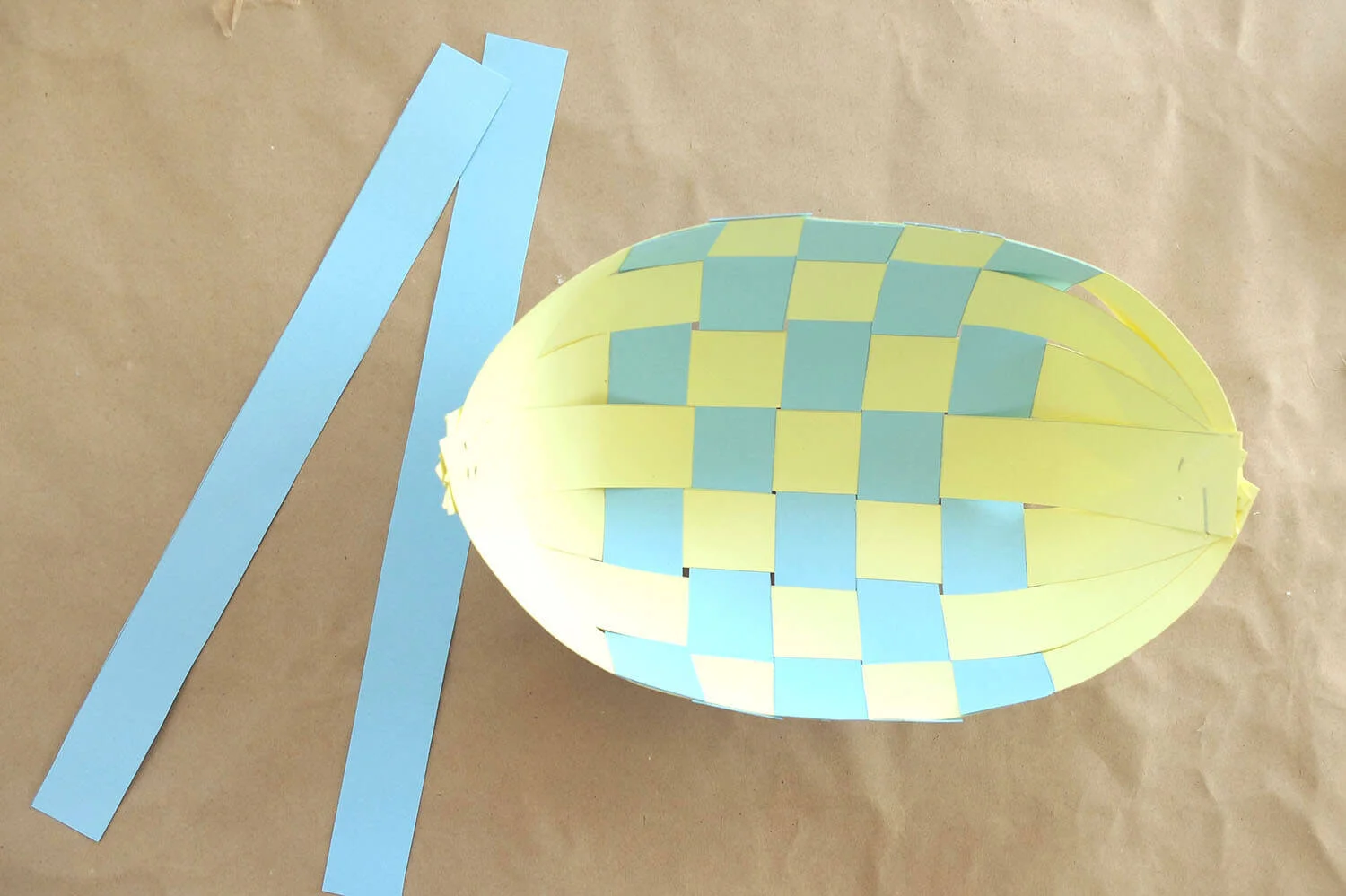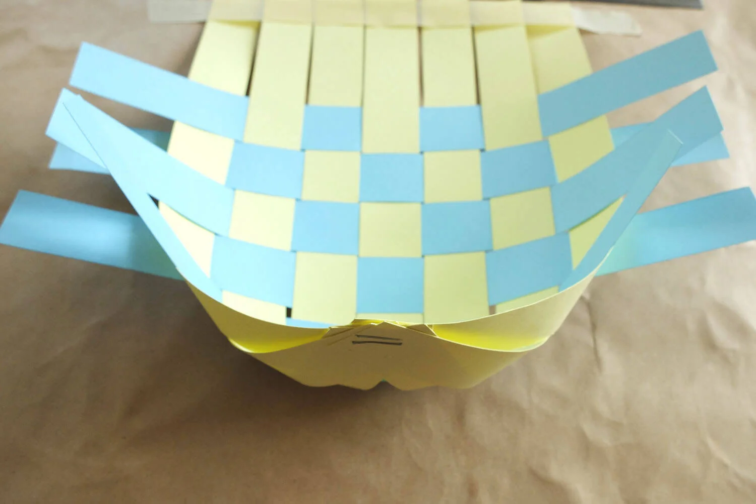 Gather together the extended strips at the bottom and staple them to create one curved end of your basket.