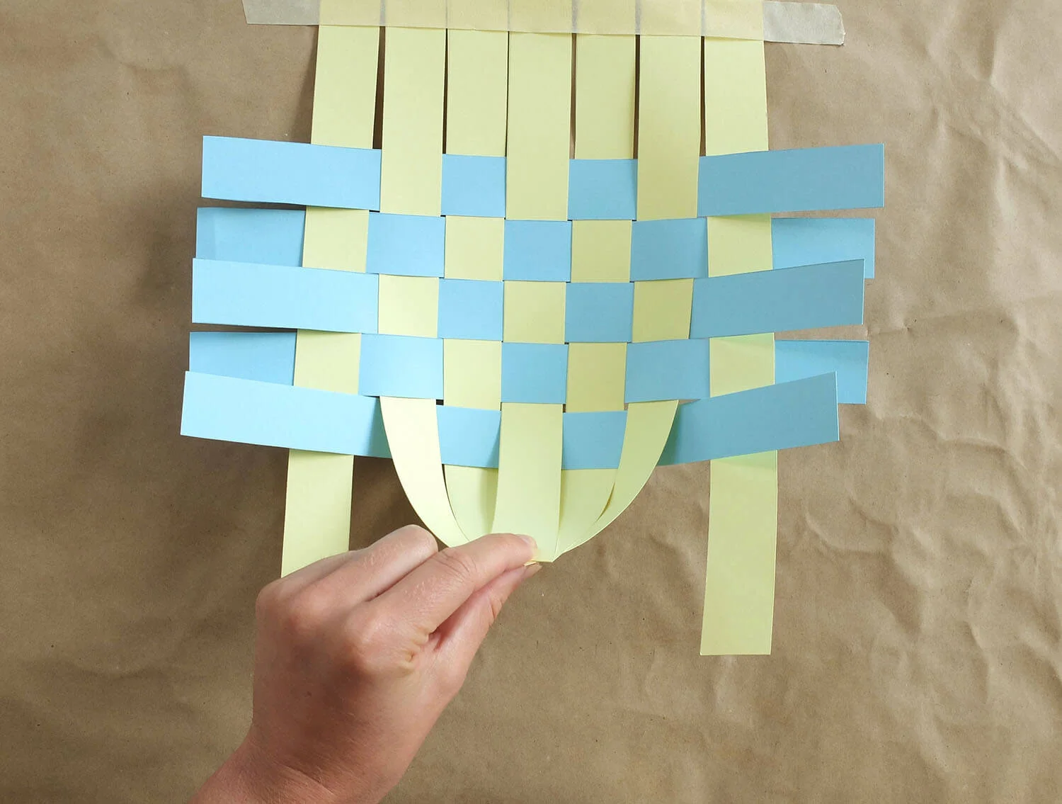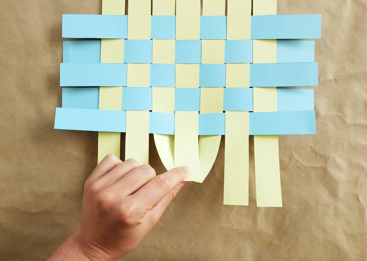 One piece at a time, weave the other strips of card under and over from one side to the other, creating a central woven square.