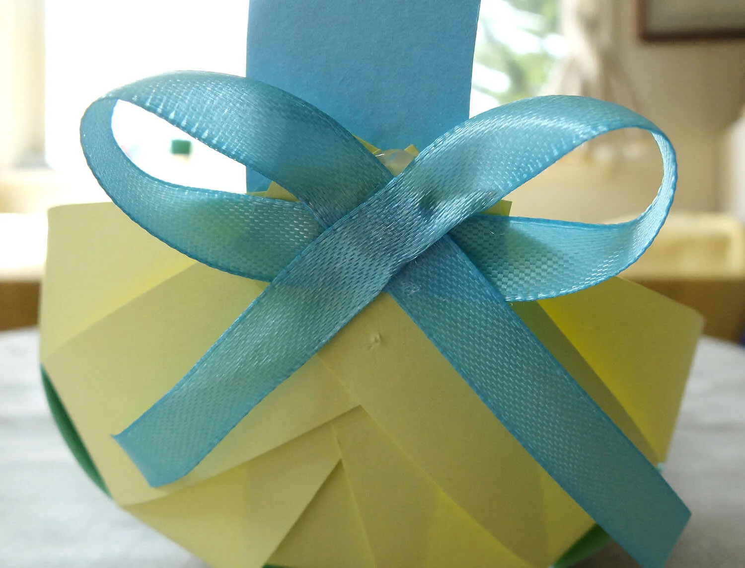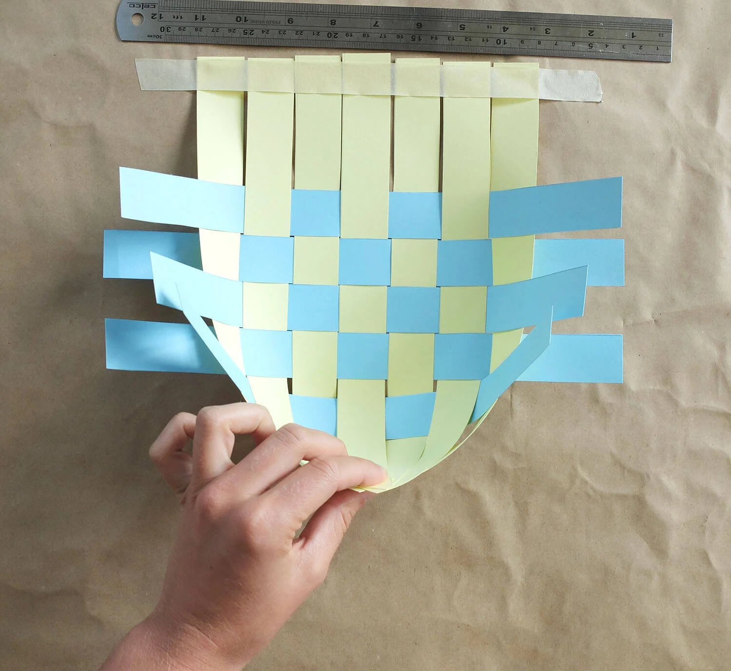 Remove the tape, bring the last strips at the top together and staple them in place, like you did with the strips at the bottom.