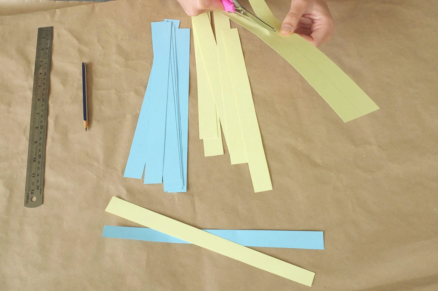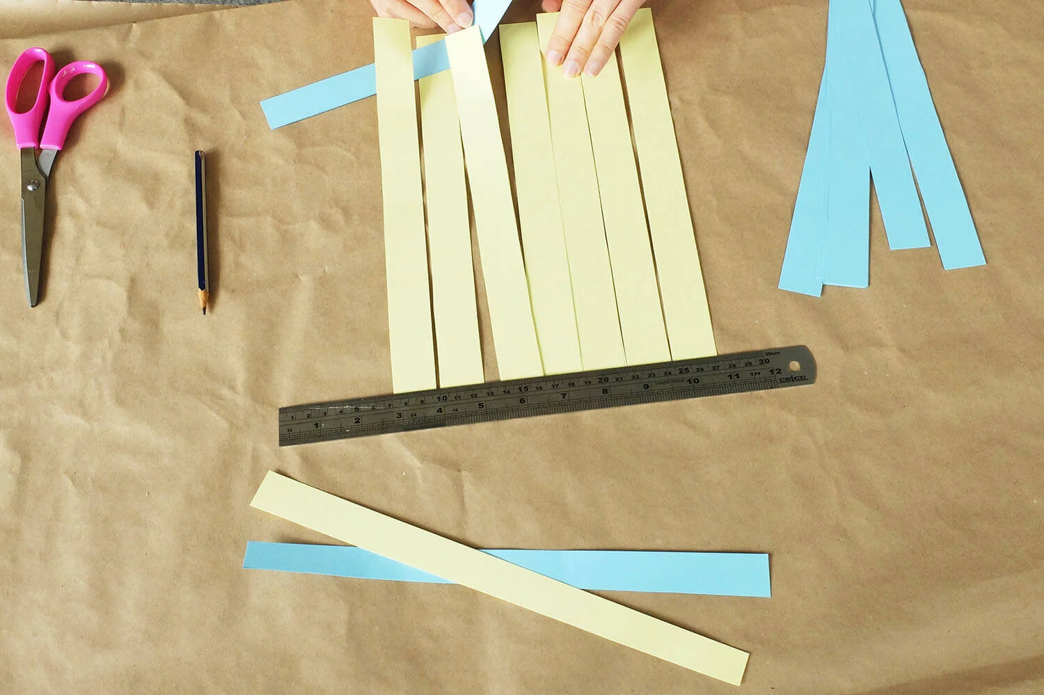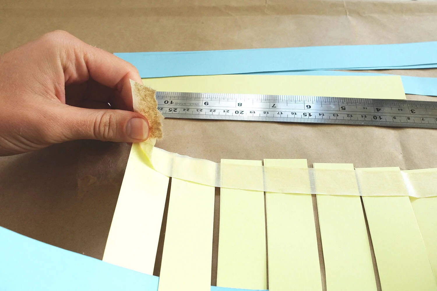 Lay all the strips of one colour next to each other and stick them to the table with one strip of masking tape at one end.