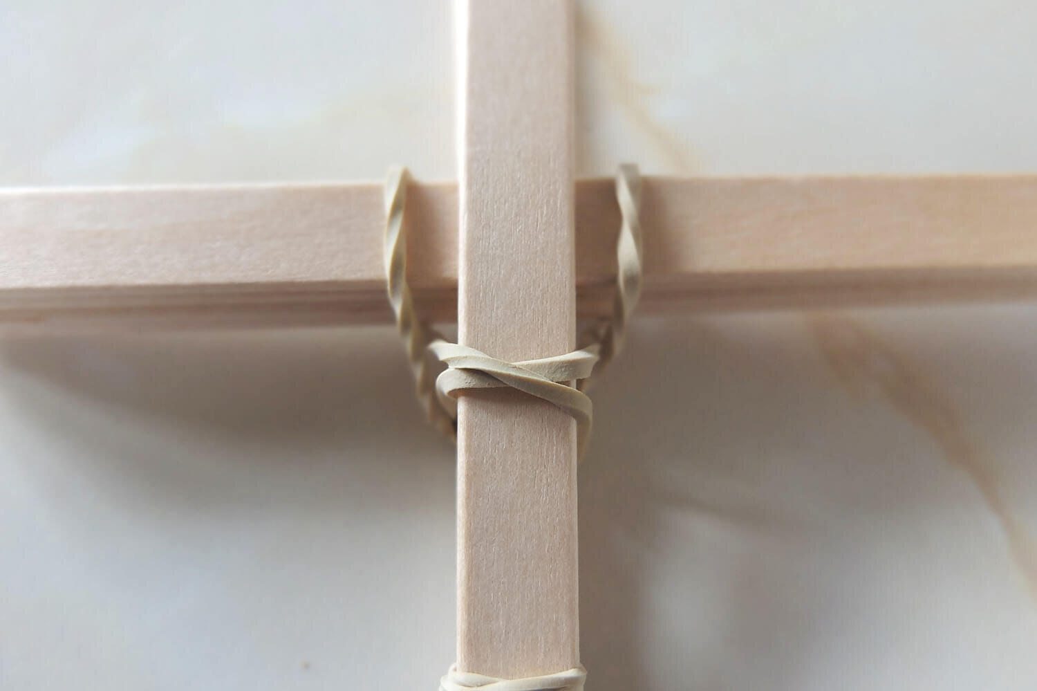 Secure the middle stack of sticks by sliding an elastic band onto one side. Twist it to tighten it around the stack and then loop it over the other two sticks. Do exactly the same for the other side of the stack.