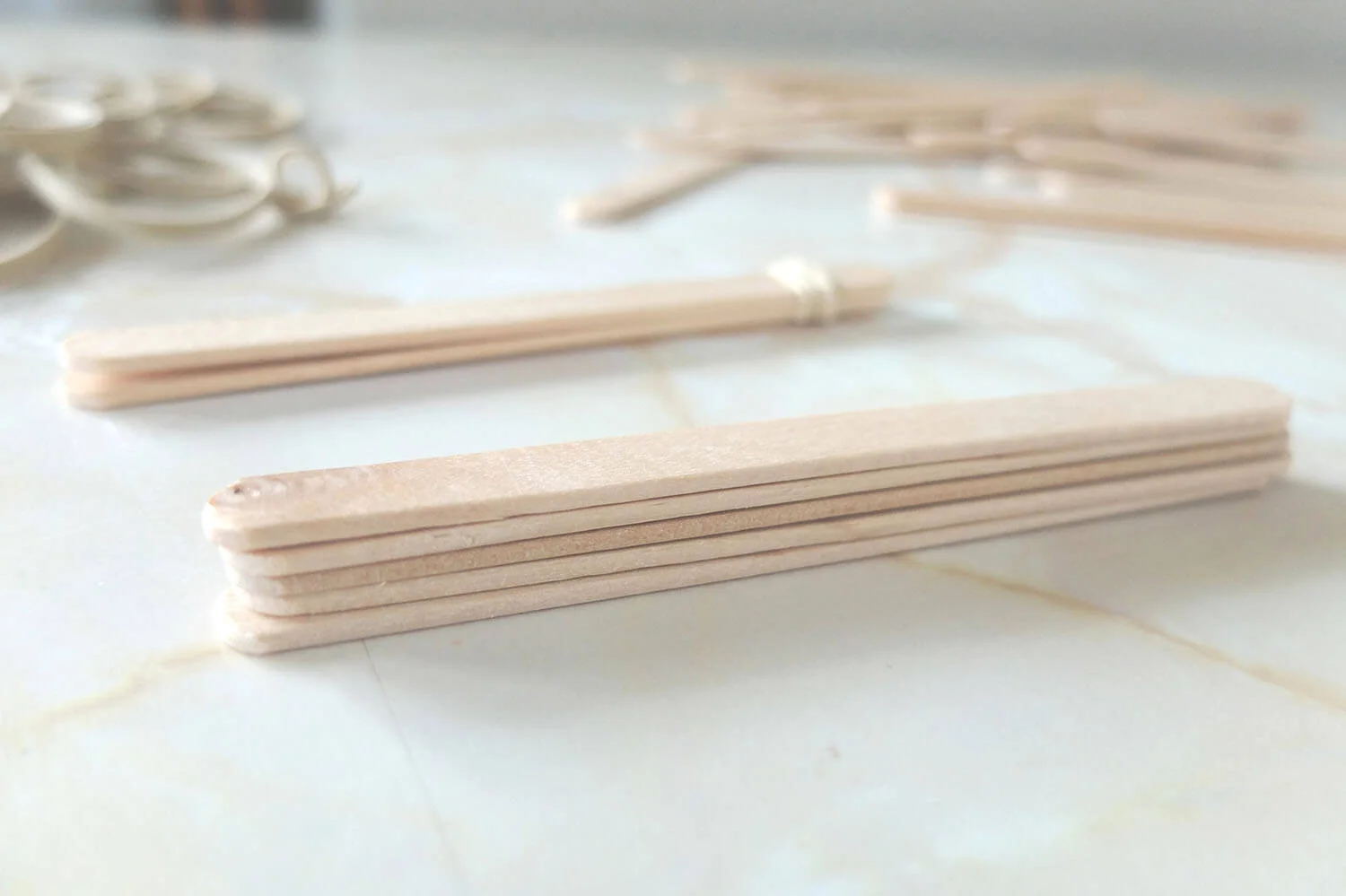 Create a stack of about five ice block sticks and slide them in between the two tied sticks.