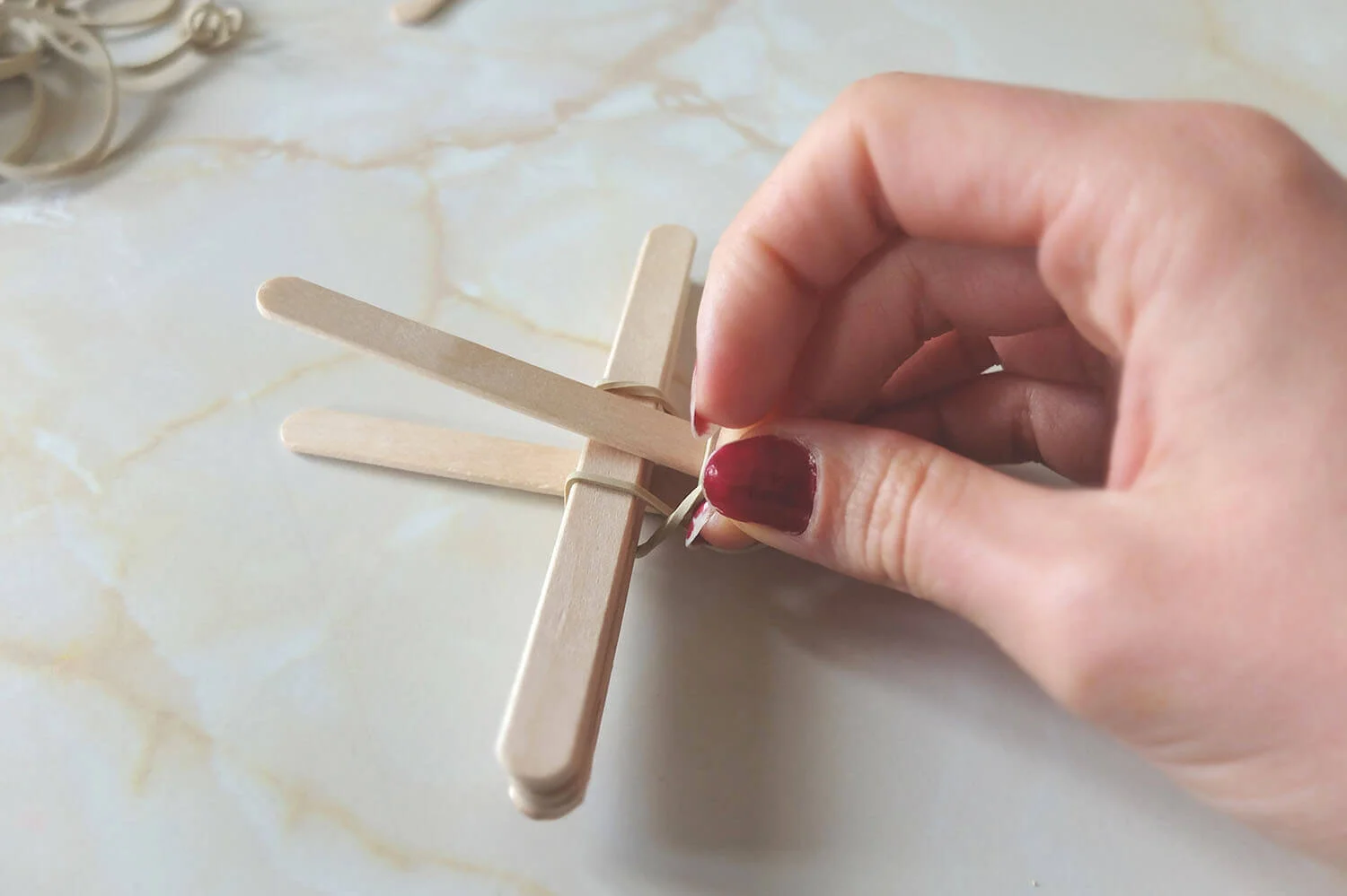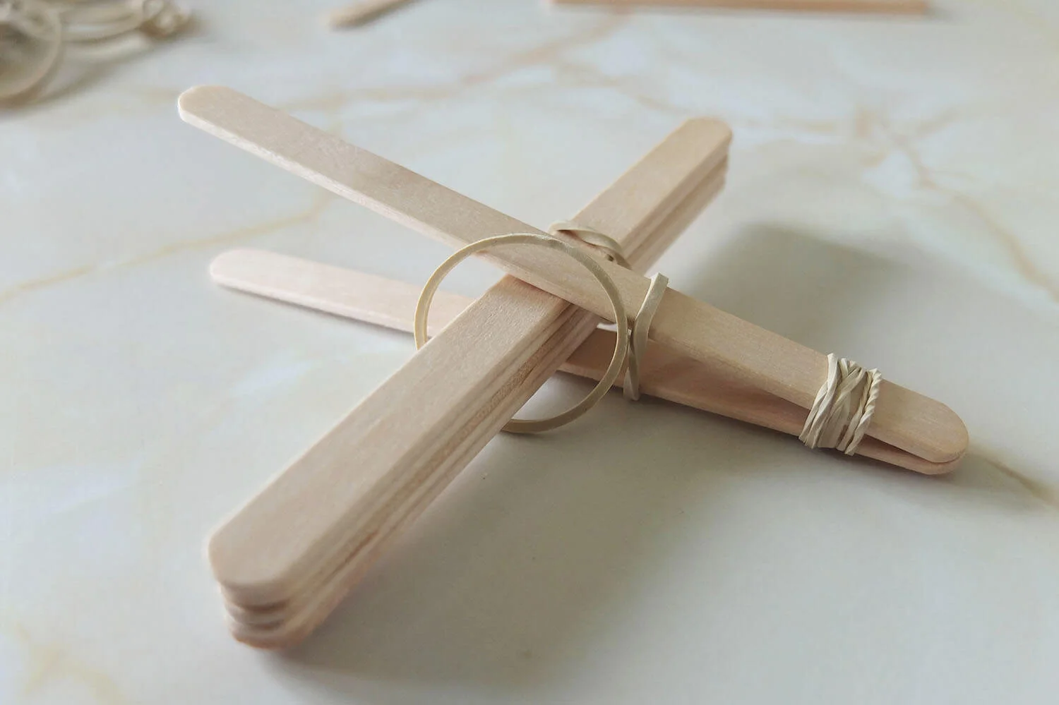 Take two ice block sticks, stack one on top of the other and tie them together with an elastic band.