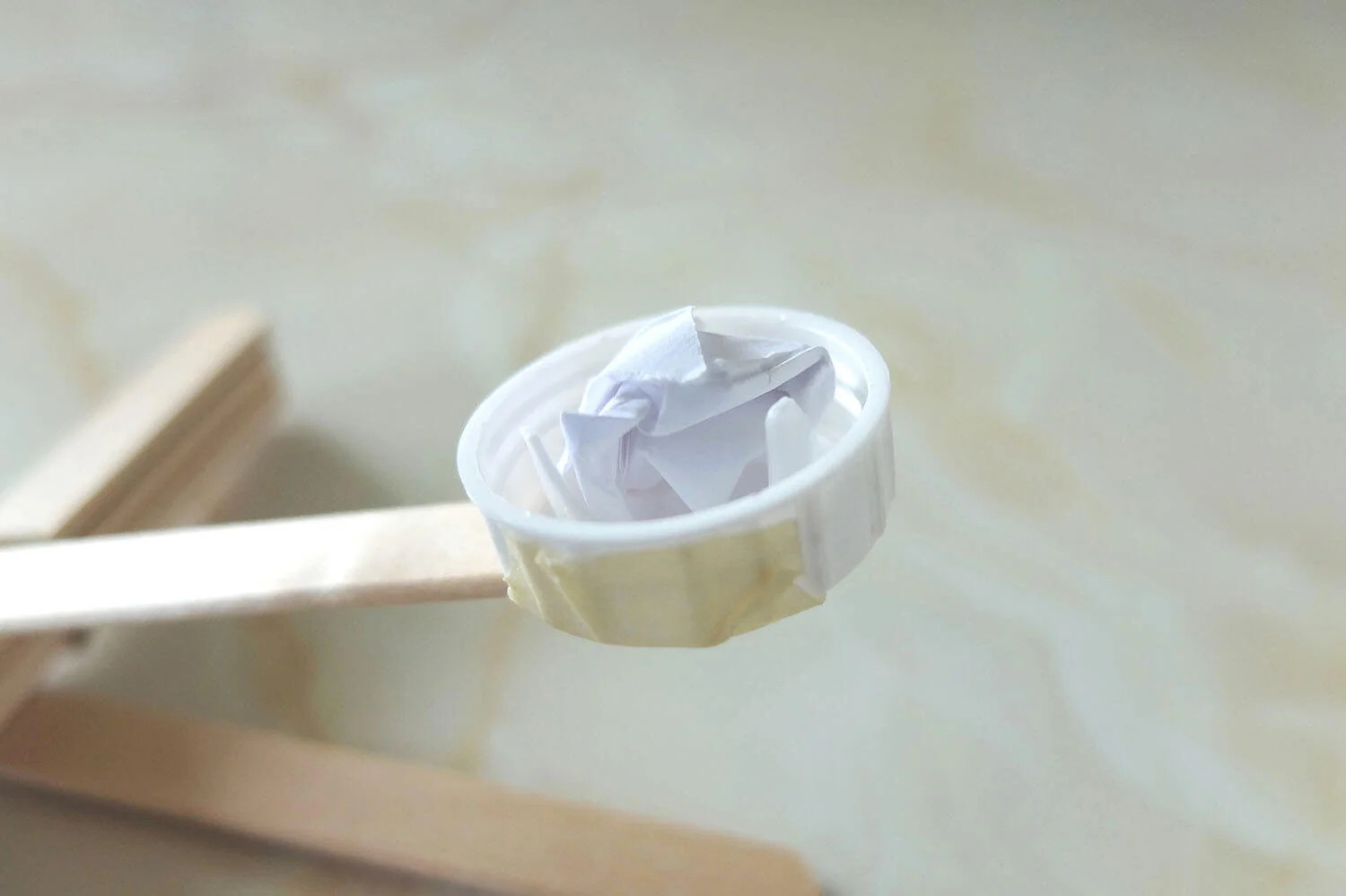 Roll up paper balls and launch them with your catapult by pulling the cap back and then releasing it. You could also use pompoms, cotton balls, marshmallows or other small lightweight objects.