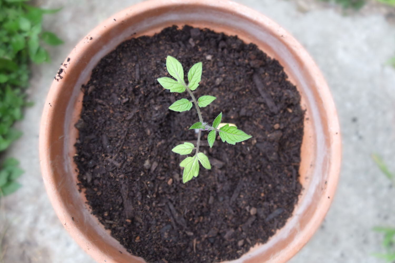 TIP: We put our pots in a small starter tray with a clear lid which worked like a mini greenhouse. You can buy these, or dome covered pots from your local garden centre.When your tomato plants are about 7-8 cm tall, it’s time to transfer them to a larger pot. Plant them deep into the soil, up to their first set of leaves.